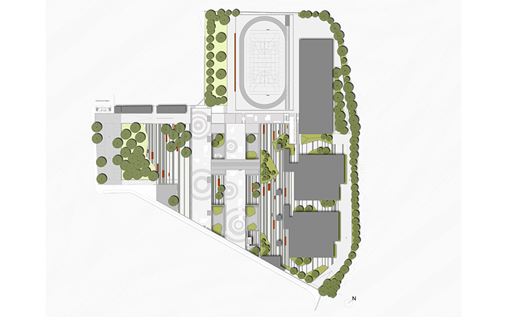 O desenho de pavimento com estereotomias distintas em riscas de tonalidades e percentagens distintas de cinzentos claros e escuros para cada área, resultou de estudos de luminosidade. O edifício cria diferentes ensombramentos em pátios e coberturas levando a que haja áreas muito luminosas e áreas muito escuras. O pavimento, conjuntamente com a vegetação, promove o aumento do conforto bioclimático e ameniza o desconforto luminoso no espaço exterior. |
