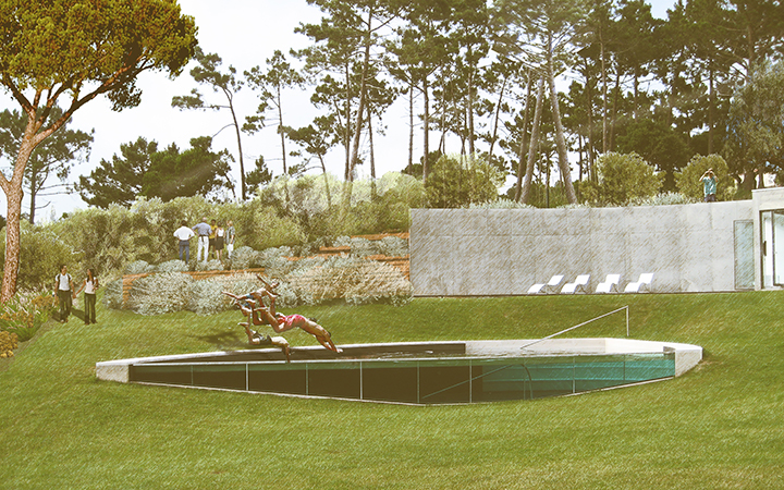 O relvado da piscina, situado na zona posterior da casa, é a área destinada a maior utilização e uso ao longo de todo o ano, e será bordejado por um tapete arbustivo baixo onde dominam os Tojos ornamentais e as Gramíneas de jardim.