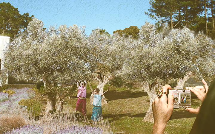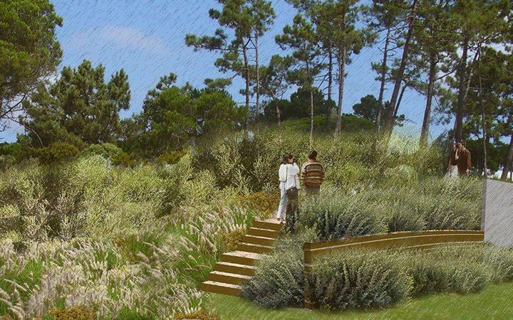 A área da entrada é um espaço fundamental (primeira e última imagem que se tem da casa e do jardim), tendo-se desenhado uma “paisagem naturalizada” de “monte”. Os prados serão cortados uma vez por ano, ficando verdes na primavera e, no verão ao ficar secos, ficam de tonalidade amarela voltando no inverno a ficar verdes. Os prados são pontuados pelos Carvalhos e Pinheiros que fazem a ligação com os Pinhais que se encontram nos terrenos envolventes e por Oliveiras que fazem a ligação com a casa. Orlas compostas predominantemente por espécies arbustivas e subarbustivas autóctones e de gramíneas de jardim são colocadas junto da casa ou dos muros de vedação. |