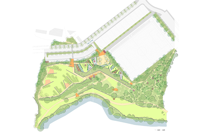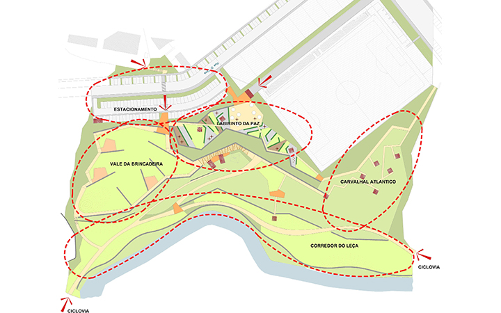 Tendo em consideração as pré-existências, condições edafoclimáticas, topografia do terreno, objetivos e temática, o traçado do espaço apresenta três macro-zonas que representam: